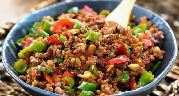 原料:牛肉末300克,花椒150克,蔥、薑適量