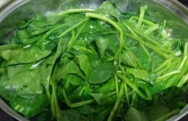2、在醒發的過程當中我們可以清洗我們想要加入的青菜,比如說菠菜或者是油菜等等,將這些青菜摘洗幹凈之後,然後鍋中放入適量的清水,大火燒開之後,做幾滴食用油,然後再加上一小勺食用鹽,這樣攪拌均勻,放入青菜焯水一分鐘左右,然後撈出放在涼水當中過一下。