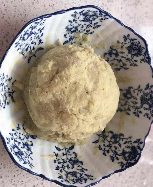 趁熱壓成泥後,加入面粉和成團。(我做的面粉量偏少,揉出來的面團稍濕,有些粘手,目的是為瞭保證吃的時候能吃到濃鬱的紅薯味兒。大傢也可以用糯米粉,比例是1:1)