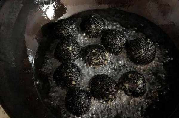炸的時候火不要太大,油溫不要太高,要不停翻動,讓小麻圓受熱均勻,芝麻紅薯丸子放入油鍋之後,一定要改為小火,否則容易造成外表焦黑,裡面還不熟。慢慢享用吧