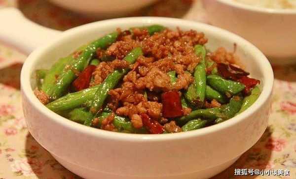 四季豆400克,豬肉碎150克,幹辣椒6條,薑1片,蒜頭1頭,生抽,鹽,糖少許,老抽。