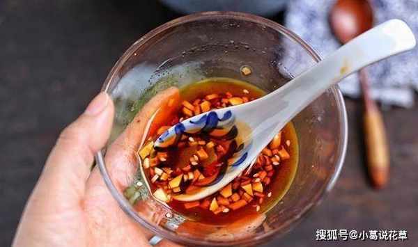 5、取一個碗,將蒜末、辣椒、胡椒粉、糖、鹽、香油、生抽依次放入,用勺子攪拌均勻。如果有些朋友喜歡吃酸的,也可以放一點醋。