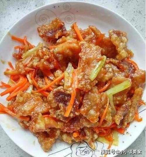 原料:豬肉;淀粉;半個胡蘿卜;色拉油;鹽;醋;雞粉;洋蔥;薑;的秘密;釀造的酒;醬油;芝麻油;糖;香菜