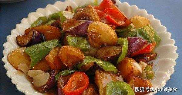 1.茄子和土豆去皮,切丁,放在爐子上;用手將青椒壓成小塊。