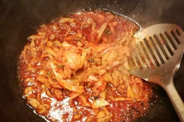 5、然後就是依次加入五花肉,五花肉可以多翻炒一會,再加入辣白菜翻炒幾下就可以瞭。這時候,一種獨特的酸辣甜的風味應該已經湧進你的鼻腔裡面瞭。