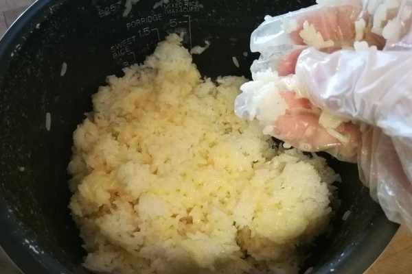 3、隔夜的米飯裡面加入打散的蛋液,攪拌均勻,然後帶上一次性手套,用手捏散,避免出現大塊米飯,導致最後調味不均勻。
