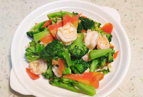 4、開第二鍋,鍋內倒入少許油,放入蒜茸和蝦仁,炒至蝦仁變色,再倒入西蘭花翻炒至順滑,加入少許鹽、生抽、蠔油和拌勻。淀粉加少許水勾芡,拌勻即可食用。