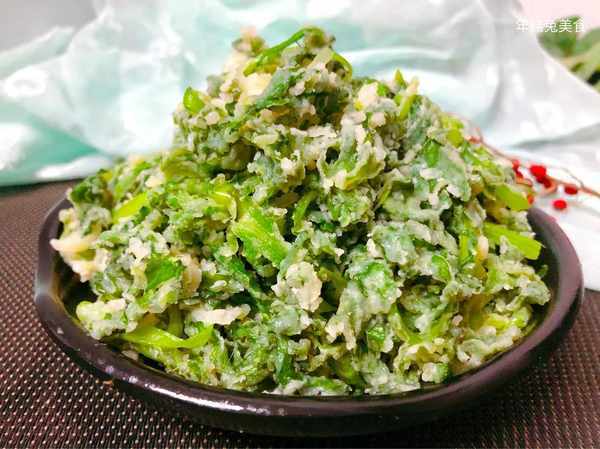 3、切好收進大一點的碗裡,放2勺面粉,1勺玉米面粉,攪拌一下使每個蒜苗段都裹滿面粉,拌完後是很幹,互相不粘連的狀態,放進鋪好蒸佈的籠屜內