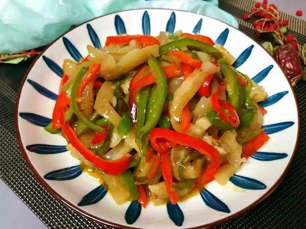 (4)鍋裡倒油,先放彩椒炒兩分鐘炒至斷生