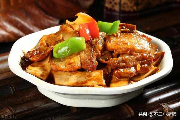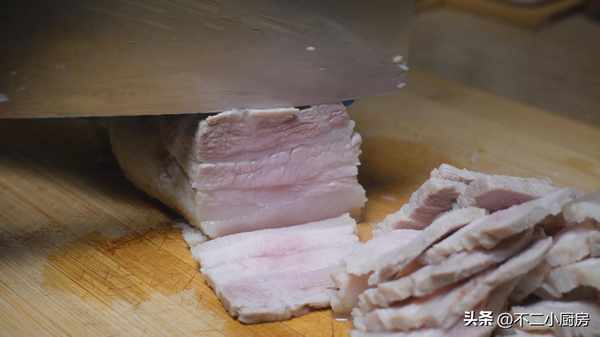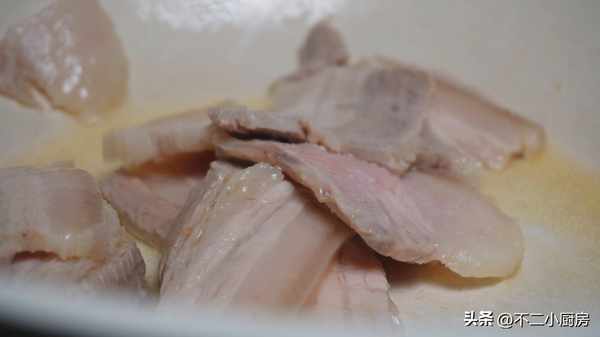 3、這個時候五花肉也煮的差不多瞭,用筷子插一下,輕輕能插透就可以瞭,然後撈出來晾涼給它切成薄薄的厚片,這裡的片一定要切的薄一點,切的薄一點,這樣才更容易入味,切好之後裝入到碗中方便下一步操作。