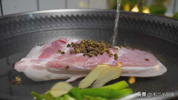 1、首先準備一塊這種五花肉,最好準備一塊種五花,這樣吃起來口感才更加好吃。然後把五花肉冷水下鍋,加入薑片,來一個小蔥結,加入少許的麻椒,再倒入適量的料酒,蓋上蓋子,大火燒開,轉小火煮30分鐘。