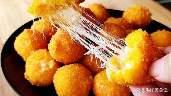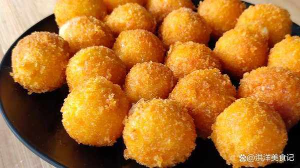 3、準備一個雞蛋攪散,再準備一些面包糠,把揉好的小圓球沾上一些蛋液,再咕嚕上一些面包糠,然後放入油鍋開始炸,全程中小火炸制就行,千萬別用大火,不然裡面的芝士碎容易冒出來。