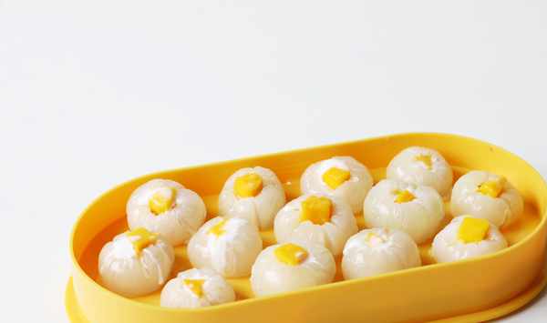4.往荔枝中間放上芒果丁,全部弄好之後,放進冰箱冷凍4個小時以上