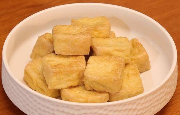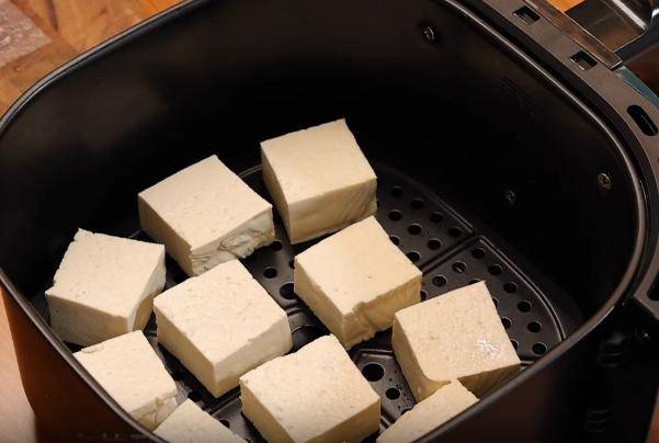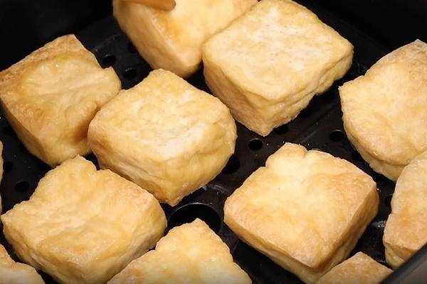 5.把泡好的豆腐撈出,再用廚房紙擦幹表面的水分。然後放進空氣炸鍋裡,將表面刷上一層薄油。空氣炸鍋設置200度,先炸10分鐘。