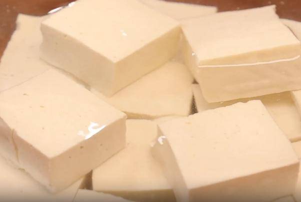 2.把切好的豆腐塊放進事先準備好的淡鹽水裡泡15分鐘,這樣可以很好的去除豆腥味。