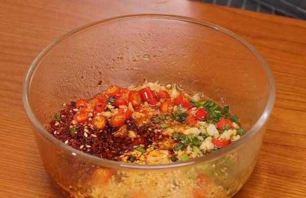 3.利用泡豆腐的時間,調一個料汁:碗裡加入蒜末,香蔥,辣椒面,小米辣(不能吃辣可以不放),熟芝麻,然後潑上熱油,激發出香味。