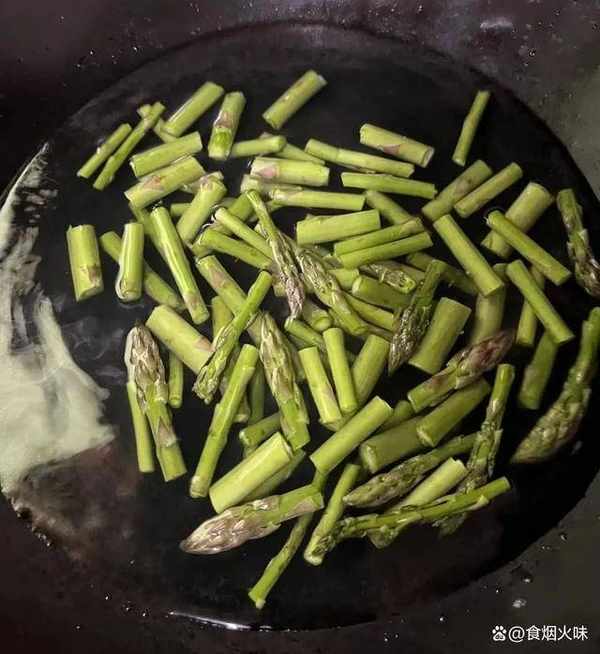 2.蘆筍先放鍋裡面焯水,焯水後的蘆筍可以去掉一部分草酸,而且使得它的顏色更加翠綠好看。