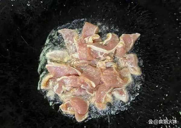 4.準備一個幹凈的鍋,鍋中水分幹後倒入油。把油燒熱再把備好的瘦肉放裡面小火炒一下,將它炒香。瘦肉下鍋炒香,炒至微微焦香之後;