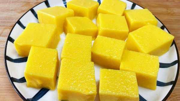 2、倒入幹凈的容器裡,把表面整理平整,然後震出裡邊的氣泡,放一旁冷卻40分鐘。再切成小方塊,香甜營養又好吃。