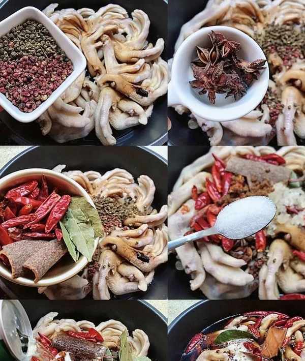 鴨學2斤、薑10片、紅辣椒25克、桂皮2塊、八角5個、花椒10克、麻椒10克、香葉5片、冰糖30克、紅糖10克、料酒90克、生抽60克、老抽60克、啤酒2罐(550ml)