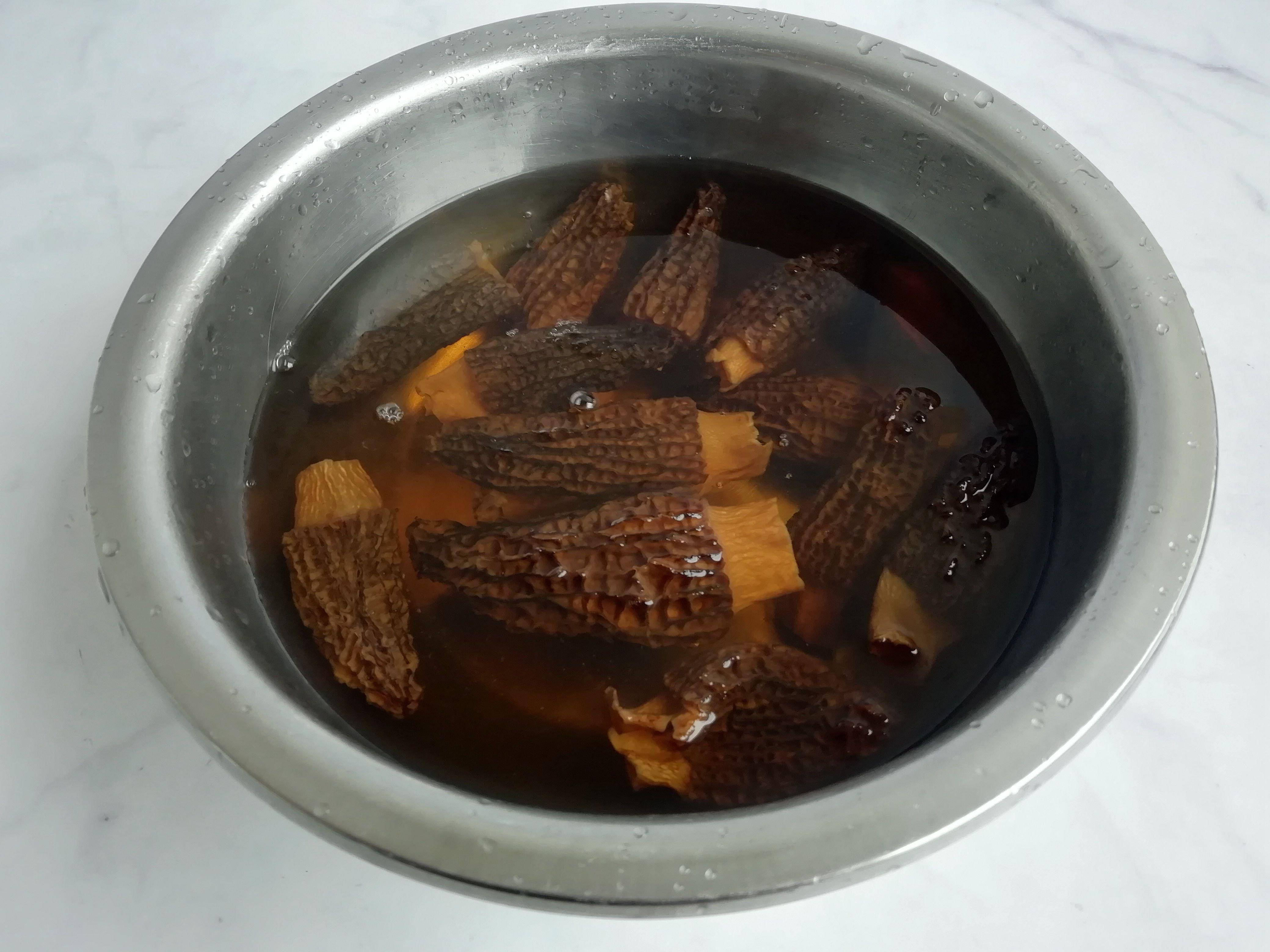 第三步:羊肚菌放入清水中,順著同一個方向輕輕地攪拌、打圈,這樣可以去掉小孔裡面的臟東西。羊肚菌不要洗太久,攪拌30秒左右就可以瞭,倒掉裡面的清水,再倒入30度左右的溫水,浸泡20分鐘,溫水可以釋放出羊肚菌的鮮味,又不會破壞它的口感。