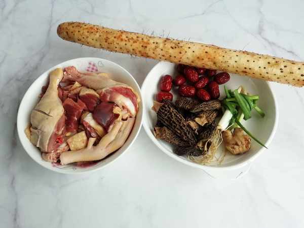 主料:土鴨肉半邊;山藥1根;羊肚菌12朵;紅棗12顆。