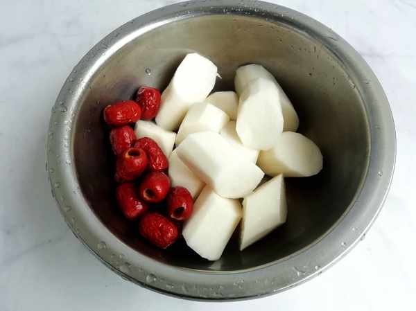 第五步:戴上一次手套,把山藥的外皮削掉,清洗幹凈,切成小段。紅棗洗凈,用去核器,把棗核去掉。