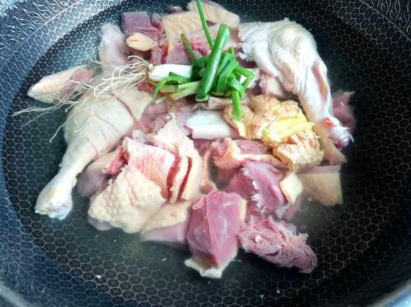 第二步:把鴨肉放入鍋中,倒入半鍋清水,加入生薑、蔥結、料酒去腥,焯水10分鐘,再次清洗一遍。