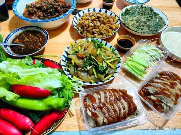 瞧瞧我傢這一桌子晚餐:烤鴨+拌拉皮+炒三丁+啤酒鴨+香椿攤雞蛋+小菜蘸雞蛋醬