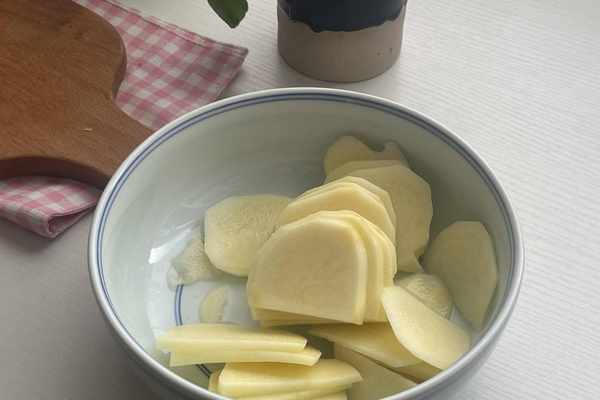 1、土豆去皮後切成薄片,放入盤子中,加入少許清水,包上保鮮膜,表面紮幾個小洞洞,放入微波爐中高火加熱4分鐘,土豆可以輕松紮肉就熟瞭。(如果傢中沒有微波爐,可以直接放入鍋中隔水蒸熟也行)。