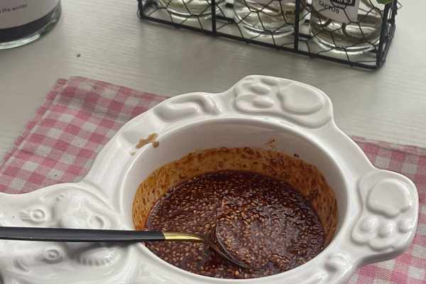 7、制作一個料汁:辣椒面1勺、蒜末、白芝麻1勺、淋上熱油2勺,攪拌均勻,再加入白糖半勺、生抽2勺、醋1勺,拌勻就行瞭。