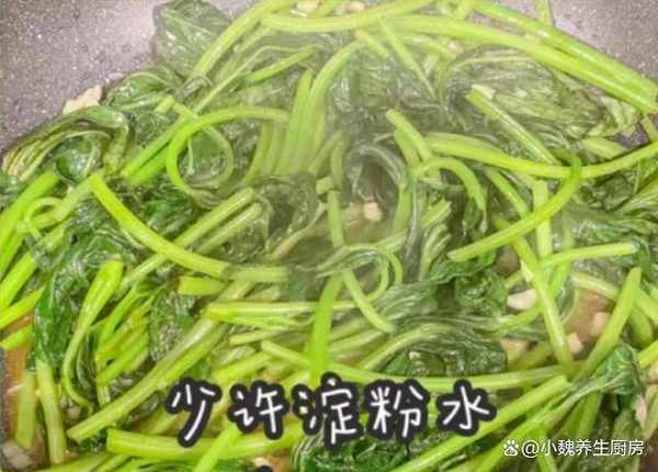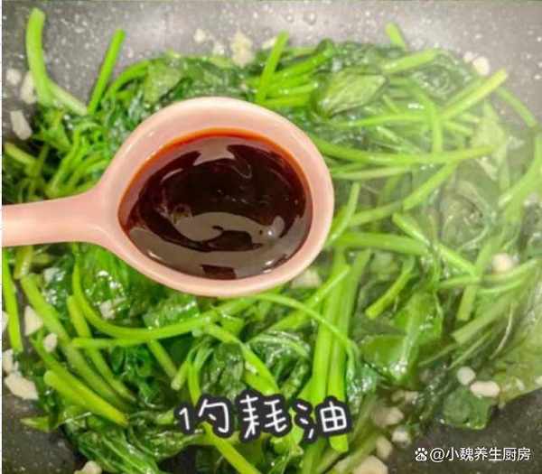 第六步:等待紅薯葉都炒出水分,加上半勺白糖和食鹽,加上半勺生抽和蠔油,加上雞精和其他佐料,勾兌一丟丟水淀粉。