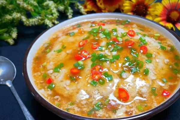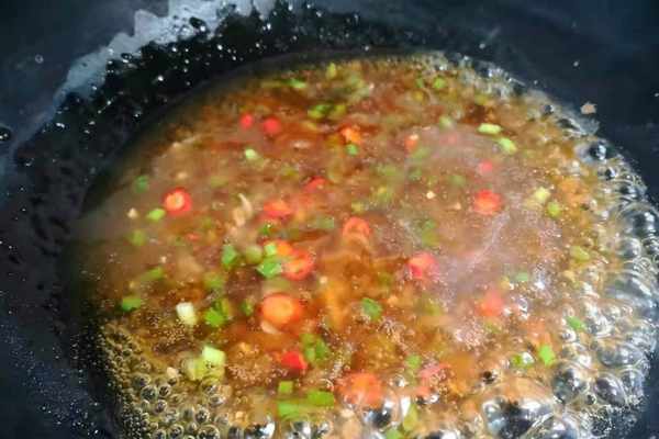 7、再調少許醬汁,肉餅出鍋前後,把湯汁倒入碗中,放入一勺生抽,一勺蠔油,1勺淀粉,少許水攪拌均勻,倒入鍋裡,放入小米椒碎,蔥花煮至濃稠。