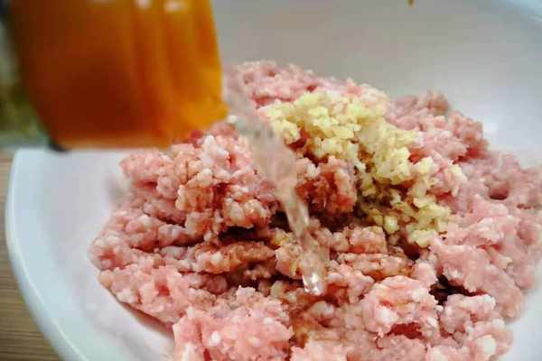 2、剁好的肉餡,加入少許薑末,少許糖和鹽,1勺料酒。