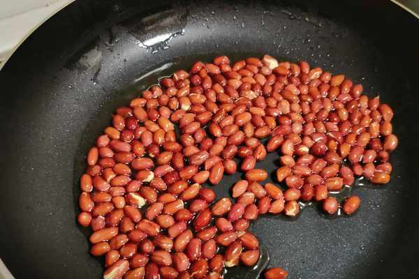 2、花生米一定要低溫油炸,變色爆出香味後即可出鍋,請註意要炸透,火不要太大,以免炸糊瞭。黃瓜拍扁切塊,豆片切寬條,香菜切碎,蒜切末,放在一個大的容器裡。