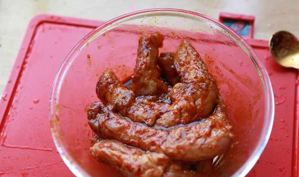 3、然後戴上一次性手套,抓拌均勻,處理幹凈,醃制備用。蓋上保鮮膜,放在冰箱冷藏裡面醃制一夜充分入味,又或者沒有那麼長時間,就醃制一個小時也可以,隻不過醃制的調料要加倍。