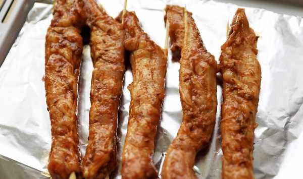 4、醃制好的雞脖用竹簽串起來。烤盤上面鋪上一層錫紙,烤箱提前預熱。