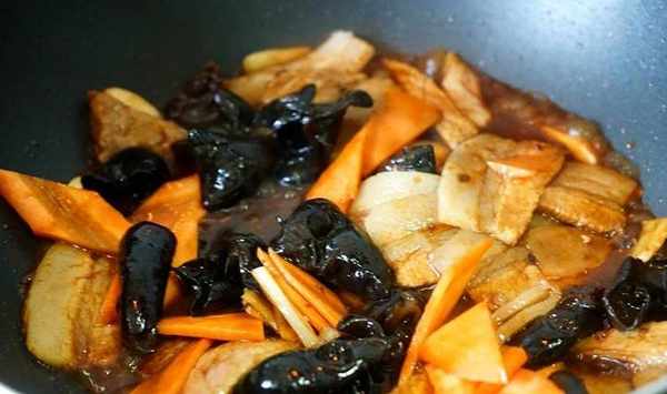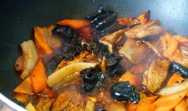 5、等高溫讓肉片微卷後,倒入胡蘿卜片、木耳,倒入備好的調味汁,快速炒勻。