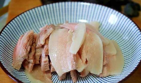 時間靈活掌握,半小時的時候,用筷子紮入肉塊,如果能輕松紮透就可以關火瞭,否則還要再煮個5-10分鐘。煮熟後撈出,晾到溫熱後切均勻肉片。