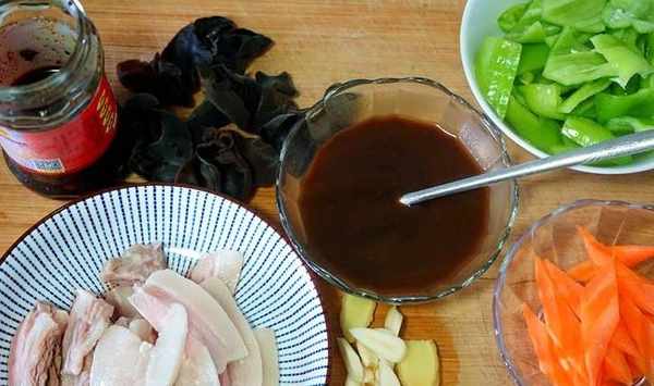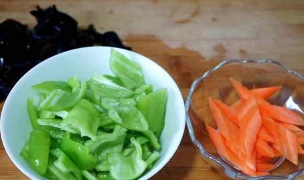 2、尖椒2根去梗切塊,半根胡蘿卜去皮切片,少許幹木耳冷水泡發洗凈,再切適量薑片蒜片備用。