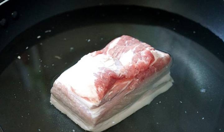 1、五花肉一塊,洗凈後放入鍋中,加入足夠的清水,煮沸後蓋火鍋,保持中火煮半小時。