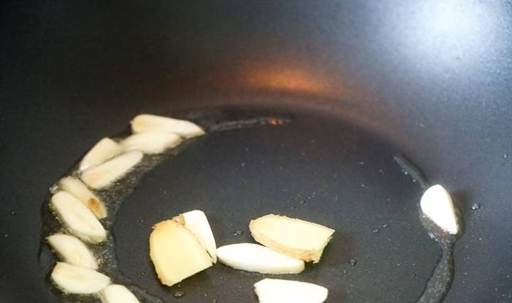 3、炒鍋內放入少許食用油,燒熱後放入薑片蒜片爆香。