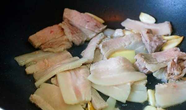傢常的做法,還可以放入洋蔥。一開始煮熟的五花肉,趁溫熱可以切的片比較薄而均勻,爆香的時候,多放些蒜片,可以讓菜肴更醇香。