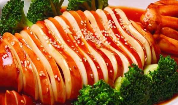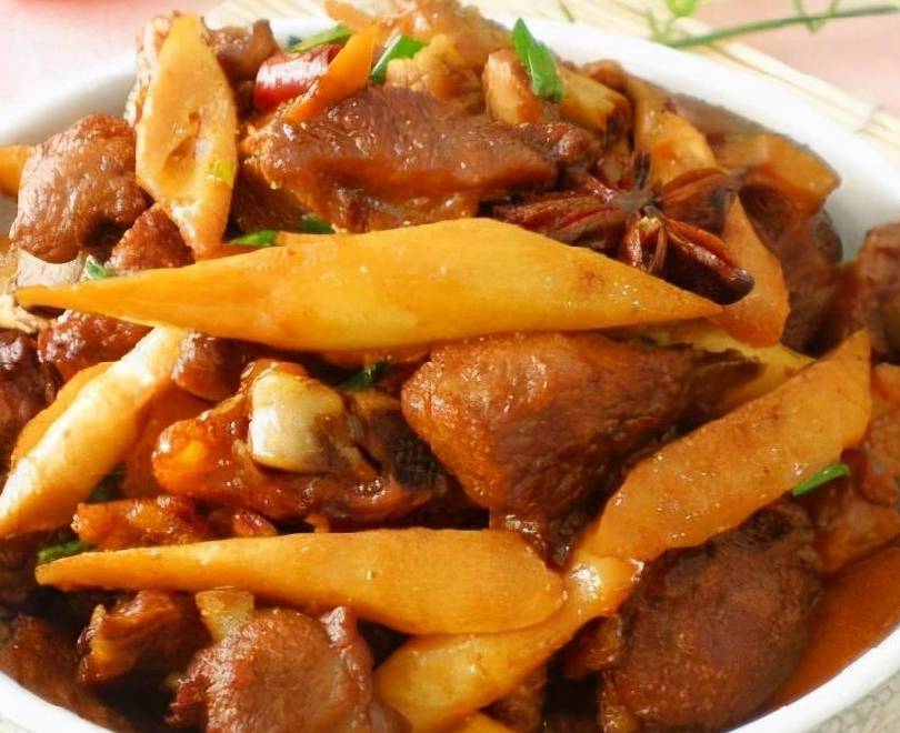 材料:鴨胸肉300克,竹筍150克。薑末、蒜末各少許,精鹽、胡椒粉、白糖各1/3小匙,味精、醬油各1/2小匙,雞精、紹酒、蠔油各1小匙,水淀粉適量,鮮湯80克,色拉油3大匙。