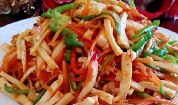 食材:千葉豆腐150g、木耳50g、尖椒30g、胡蘿卜50g、蒜適量、紅幹椒適量、糖1小勺、白醋半勺、老醋1小勺、鹽2g、胡椒粉少許、水淀粉少許、生抽老抽1小勺、幹淀粉1小勺