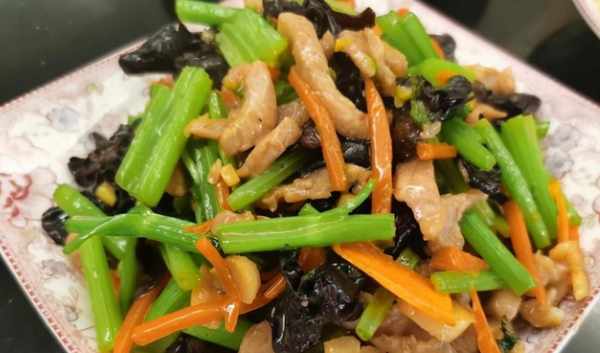 材料:芹菜2棵、豬瘦肉200克、黑木耳2朵、胡蘿卜1/2根、薑3片、蒜2瓣、鹽1茶匙、雞精1/2茶匙、料酒1/2湯匙、生抽1湯匙、生粉1/2湯匙