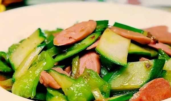 2、鍋中熱油,倒入黃瓜片翻炒,倒入火腿腸片繼續翻炒,最後調入一點雞粉即可。