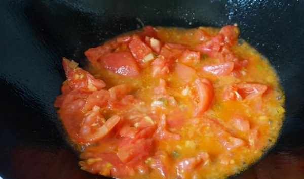 3、首先鍋內加入少許底油,先將蔥花下入鍋內炒出香味,出香味後,再將西紅柿丁下鍋,開大火翻炒上30秒,把西紅柿炒出湯汁來,然後直接加入清水800克燒開。