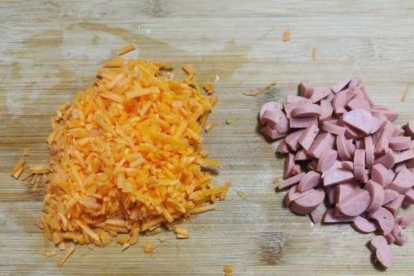 準備食材:隔夜米飯一碗,雞蛋兩個,蔥花,胡蘿卜,火腿腸兩根。