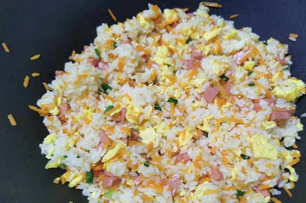 2、重新倒油,蔥花爆香,加入胡蘿卜、火腿腸翻炒出香味;